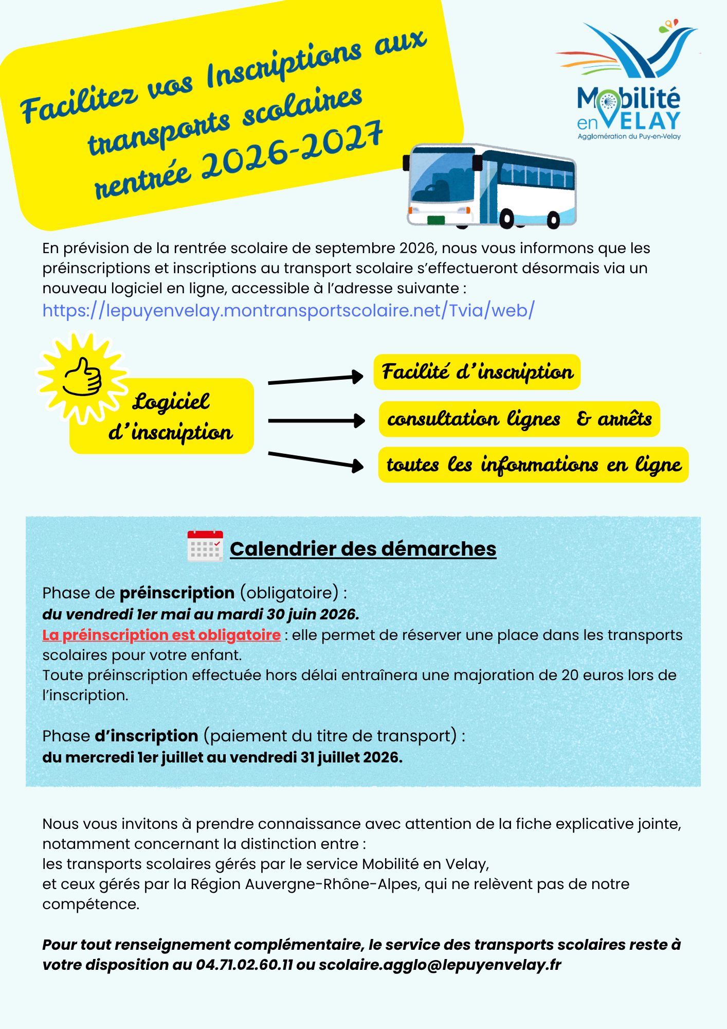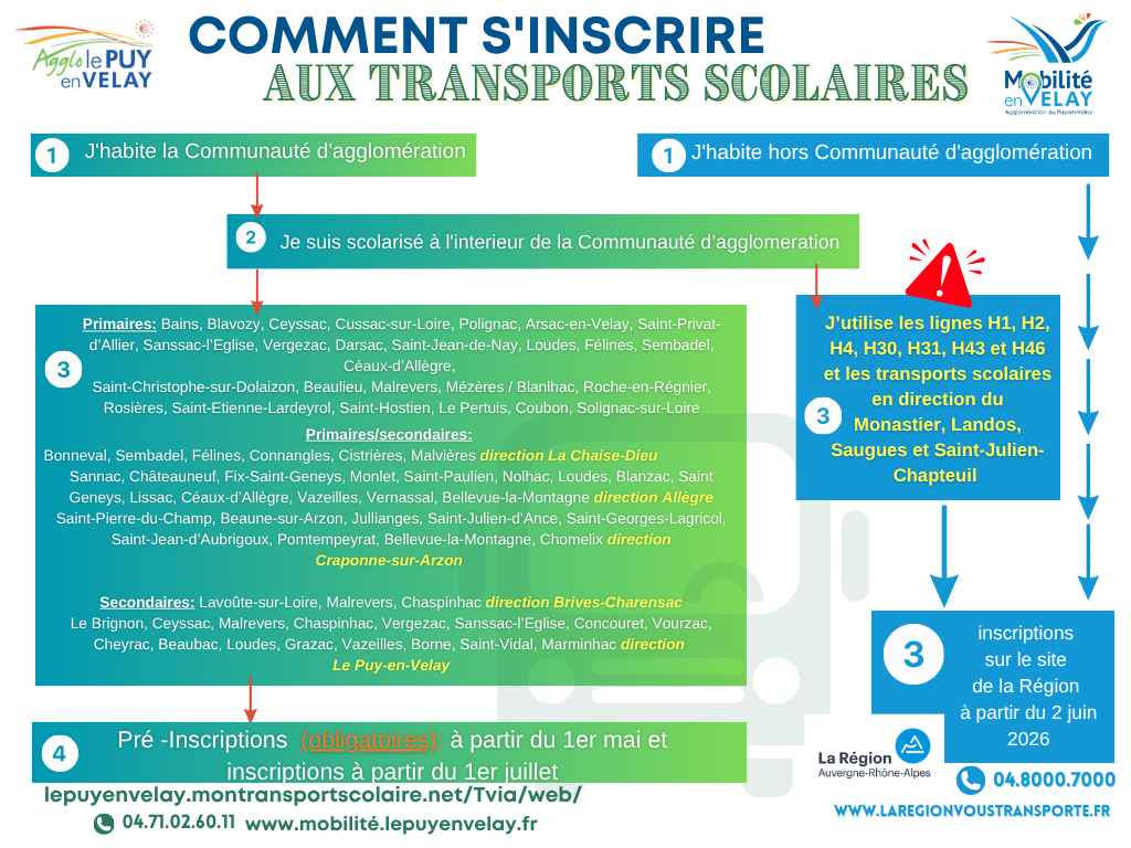 Pour tout renseignement complémentaire, le service des transports scolaires reste à votre disposition au 04.71.02.60.11 ou 04.43.18.01.22 ou scolaire.agglo@lepuyenvelay.fr